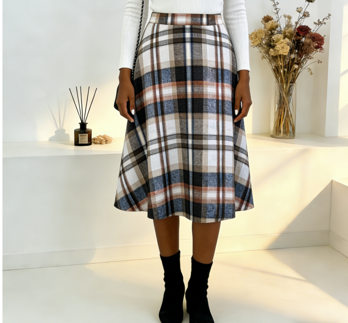 Joyinspring Women's Winter Natural Waist Plus Size Magenta Checkered Casual Ruffles Knee-Length A-Line Flared Fishnet Skirt