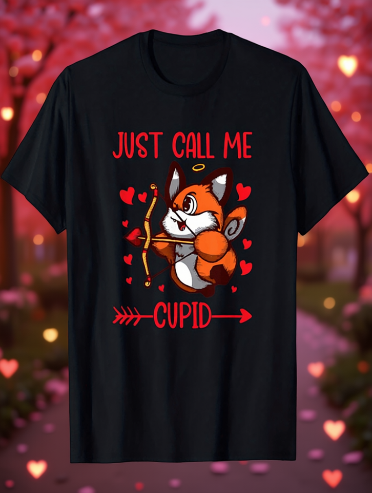 Just Call Me Cupid Valentine's Day T-Shirt Black Red Hearts Cartoon Graphic Men's Regular Fit Short Sleeve Round Neck