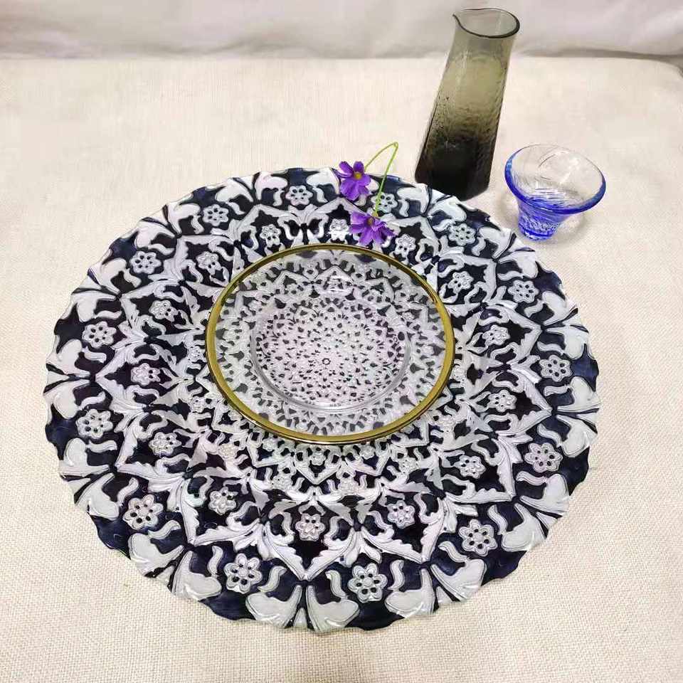 K11 Wedding Eco-Friendly Glass 13 Inch 33cm Bottom Bubble Ray Edge Color Splicing Transparent Plate Dish Charger Plates