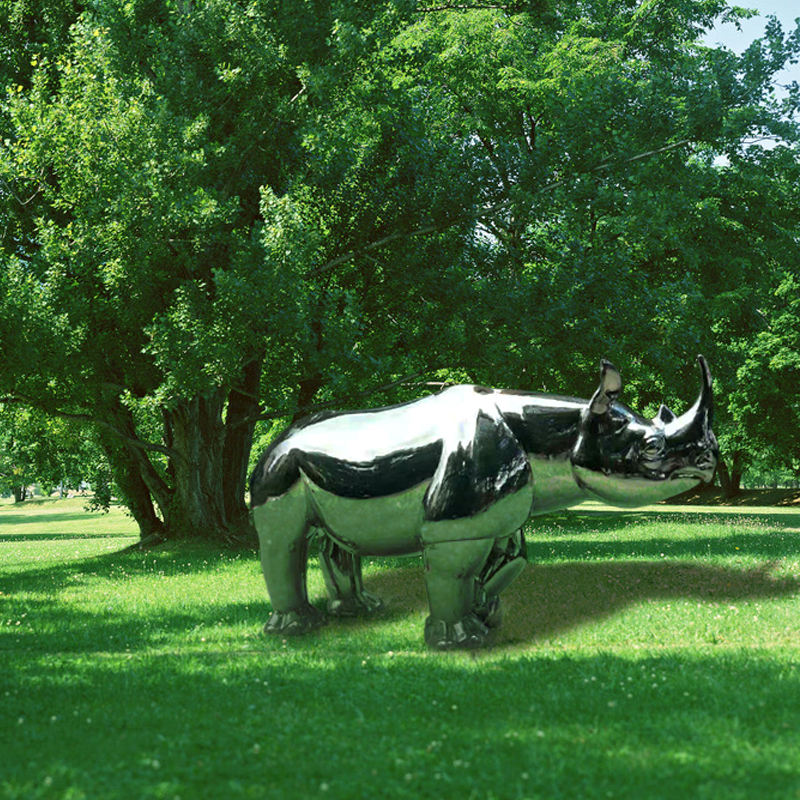 K305 Outdoor Garden Rhino Glossy Metal Statue Animal Lifelike Public Park Landmark Lawn Urban 3D Wildlife Display Sculpture