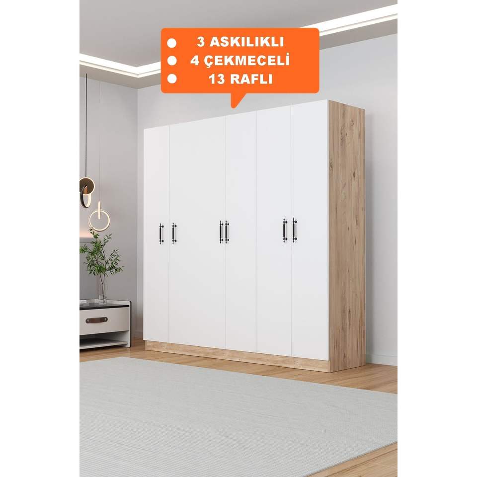 KALE 6-Door Melamine Board Freestanding Wardrobe in White 4 Drawers 3 Hangers 13 Shelves Space-Saving for Hotels and Bedrooms