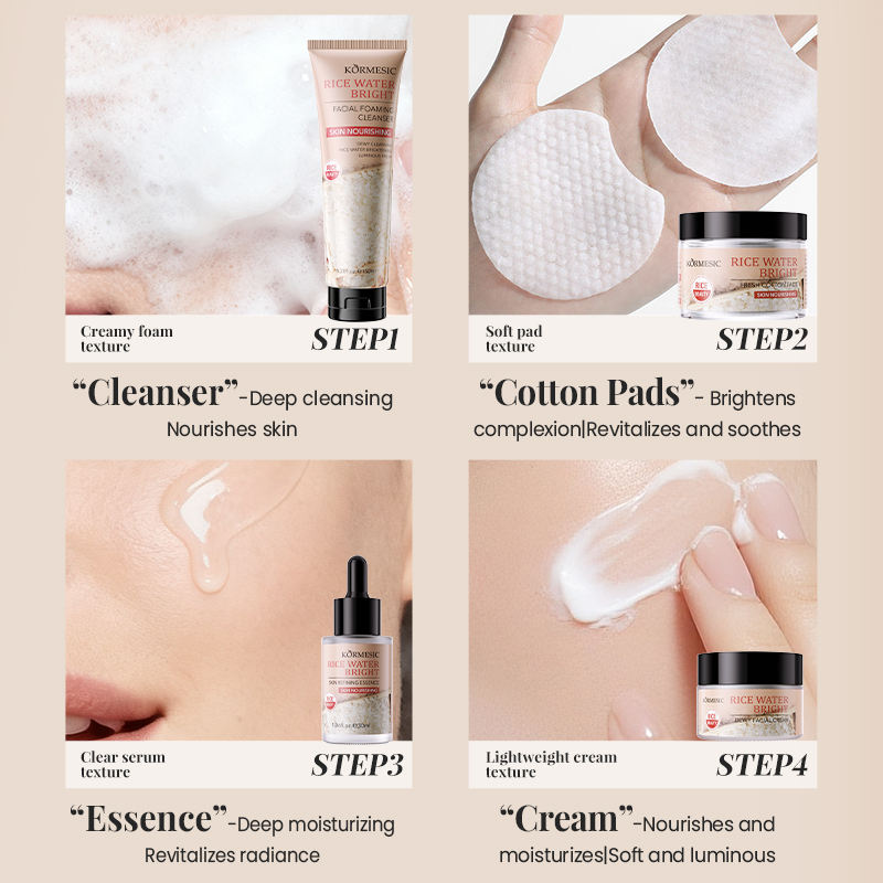 KORMESIC Private Label OEM Rice Water Whitening Face Body Skin Care Set Rejuvenating Cream Cotton Pads Korean Skin Care Product