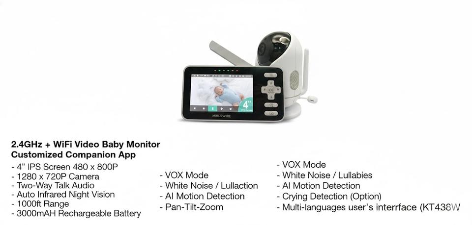 KT-438W 4 Inch IPS Screen Wireless Video Baby Monitor 2.4GHz FHSS Security Camera with Two Way Audio and Temperature