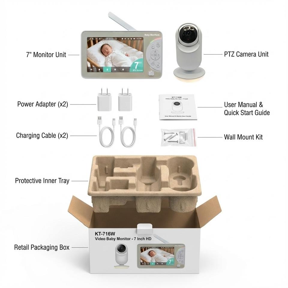 KT-716W Tuya Smart Life App Control Video Baby Monitor 1080P HD 2.4GHz 7 Inch LCD Screen Auto Tracking Motion Detection OEM ODM