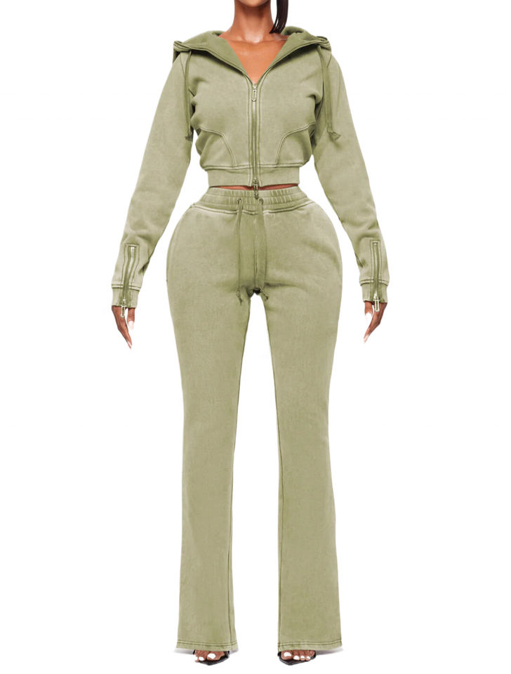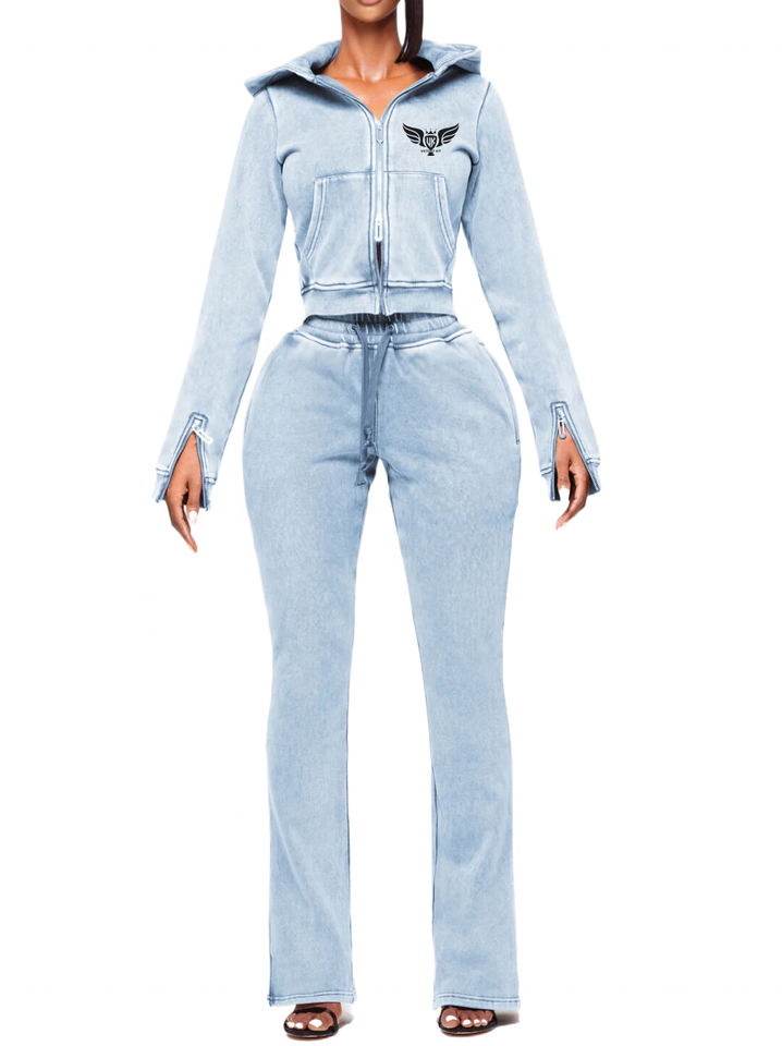 KY Acid Wash 100% Polyester Breathable Eco-Friendly High Quality Exclusive Zip Crop Hoodie Ladies Tracksuit 2 Piece Set