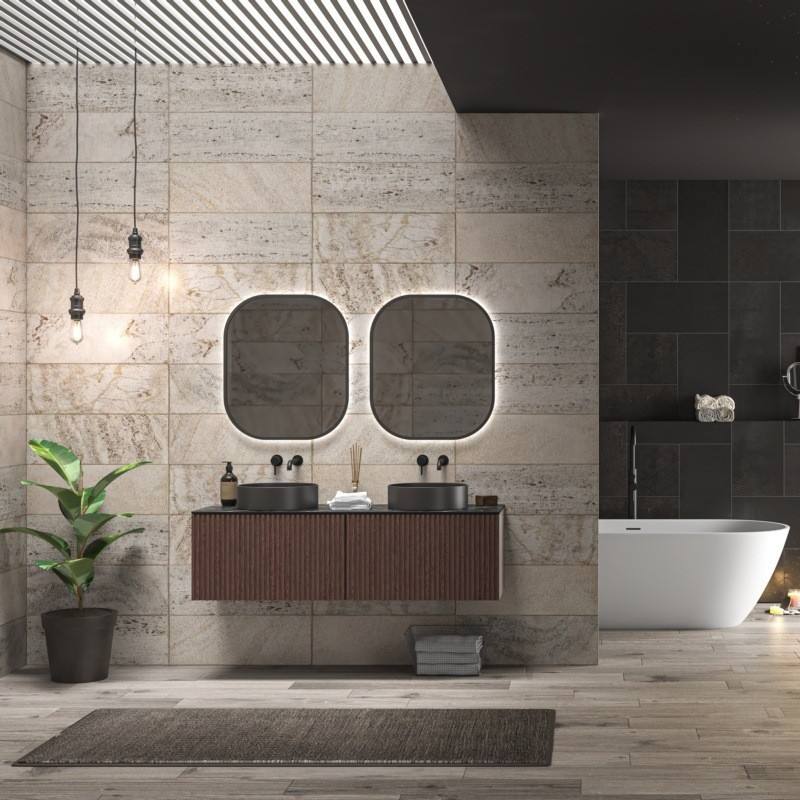 Kamalu KDS-140P 140cm Ribbed Oak Wall-Hung Bathroom Cabinet Water Resistant Solid Wood with Mirror European Design for Hotels