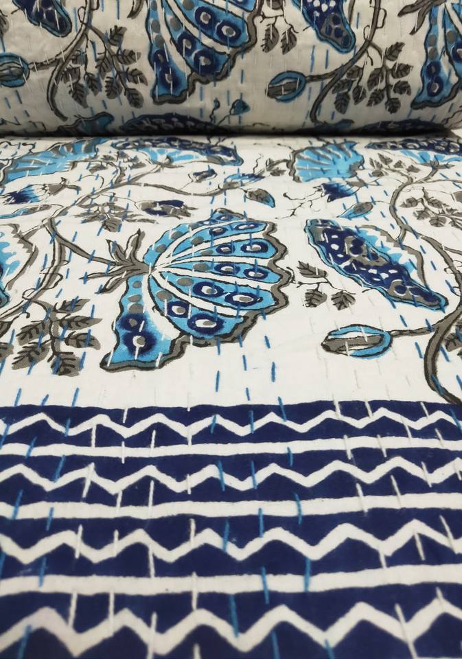 Kantha Quilt Hand Block Floral Print Bedding Handmade Indian Bedspread Printed Vintage Home Decor Throw Cotton Blanket