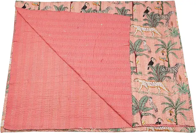 Kantha Quilt Reversible Blanket Bedspread Indian Throw with Animal Print Fabric Chic Boho Chic Duvet Coverlet Bedding