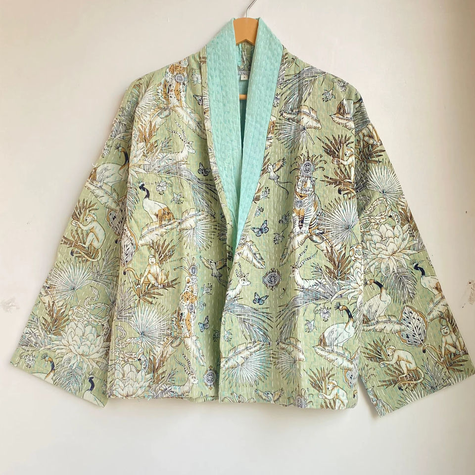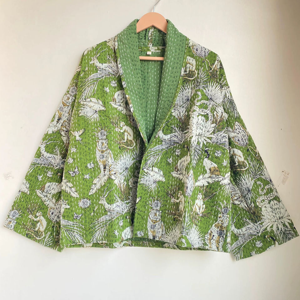 Kantha Jacket Short Front Tie Open Jacket Coat Japanese Jungle Print Jacket Cotton Women Festival Outerwear Christmas Gift