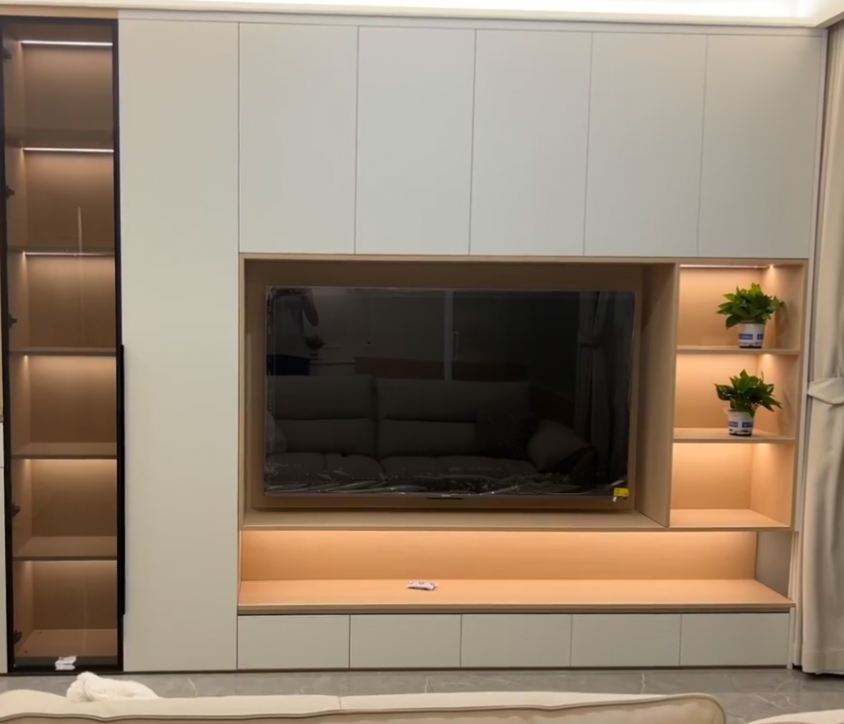 Kayu Solid Modern TV Cabinet Wall Mount Design in Particle Board Wood Style