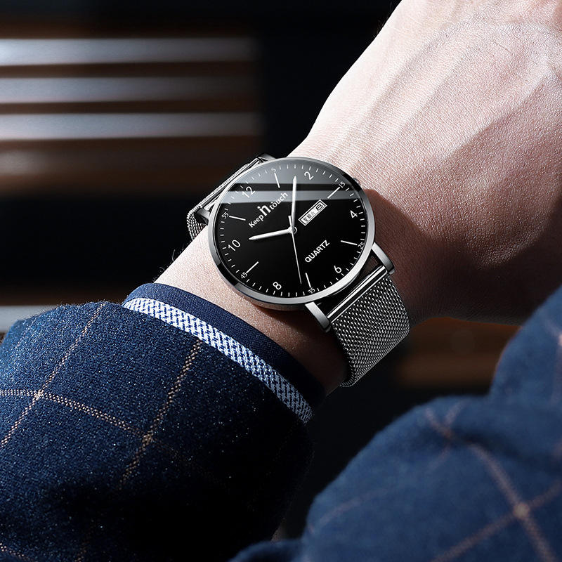 Keep Touch Men's Quartz Watch Case Stainless Steel Mesh Band 21cm Analog Glass 3BAR Water Resistant Push Button Hidden Clasp