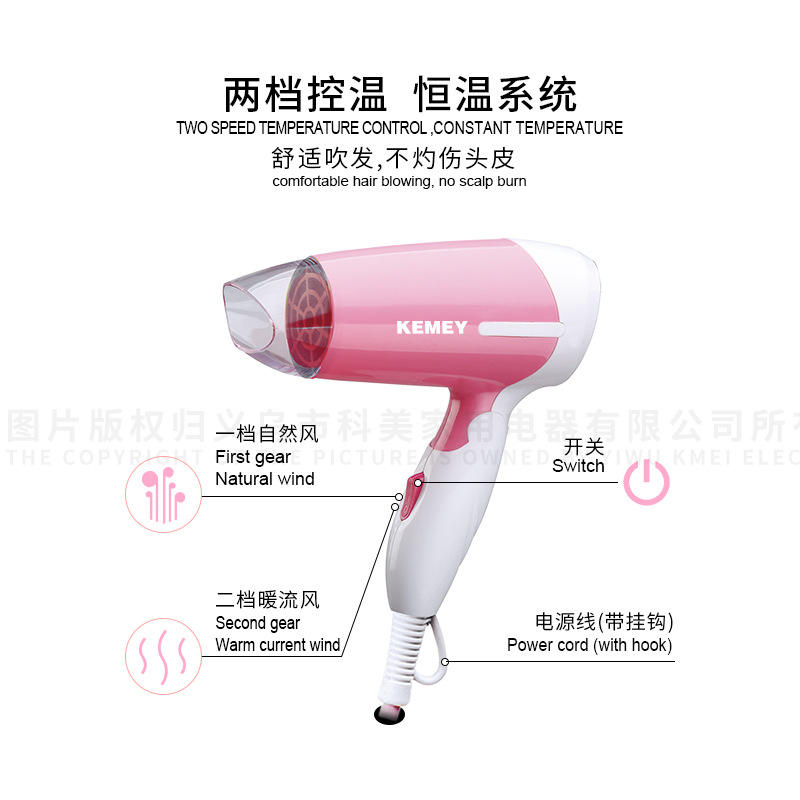 Kemey Hair Dryer Km-6830 Pink Foldable Ionic Compact With Concentrator And Diffuser Nozzle For Home And Hotel Use