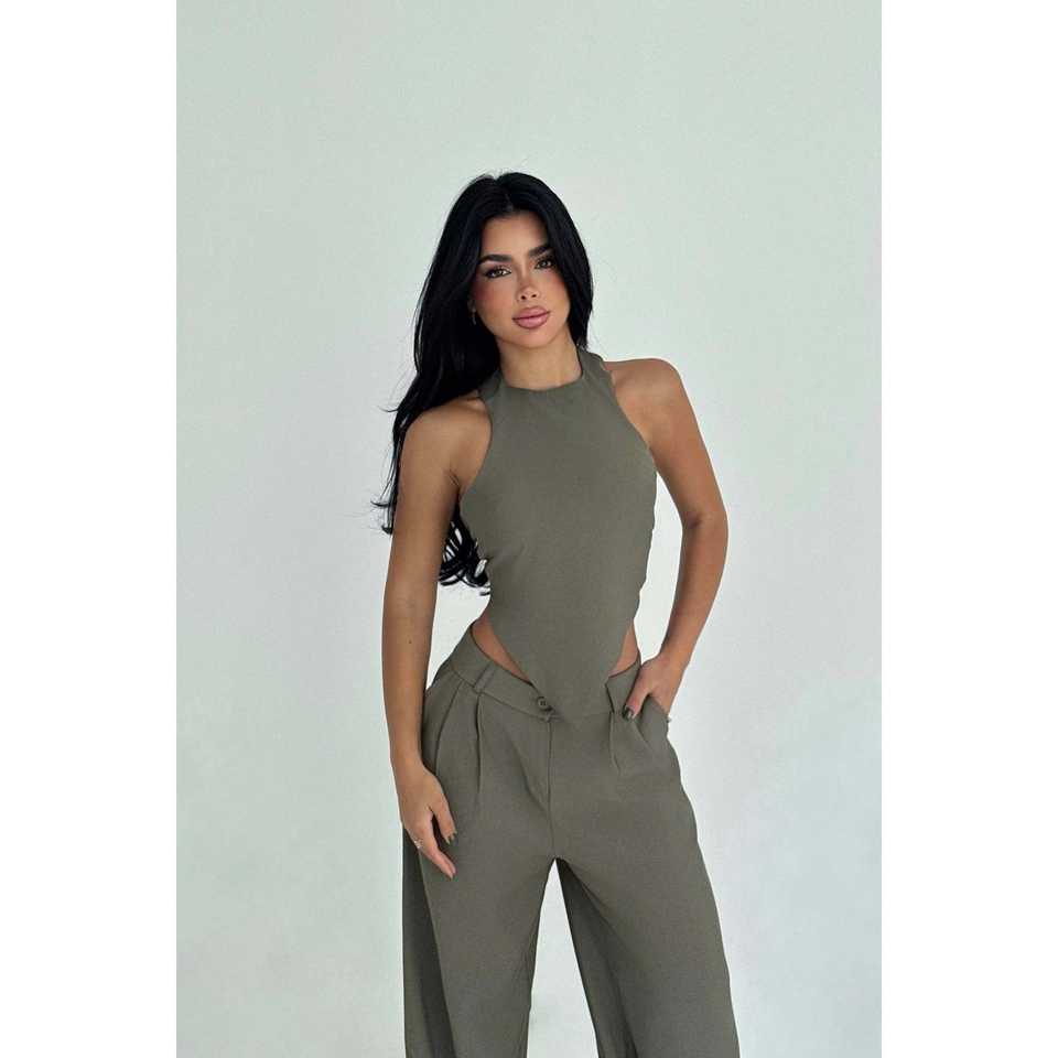 Khaki Pebble 2-Piece Summer Shorts Set Loose Fit Above Knee Length Top and Trousers Available in XS and L Sizes MOQ 3 Pieces