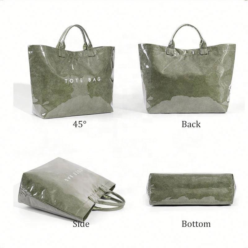 Khaki Tote With Large Capacity Waterproof Pvc Dupont Paper Washed Kraft Stylish Love Design Fashionable Shopping Bag
