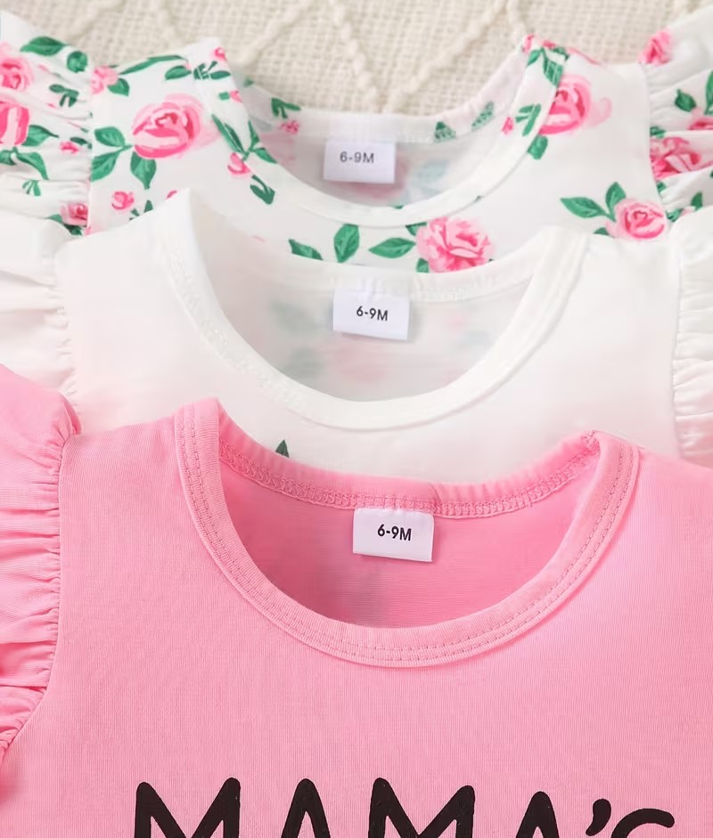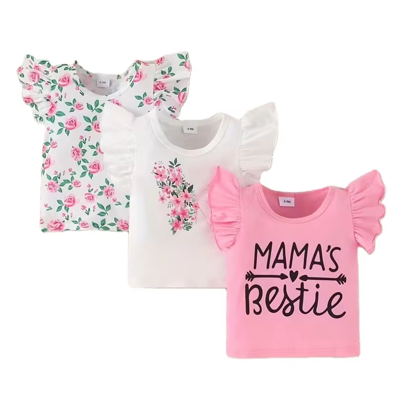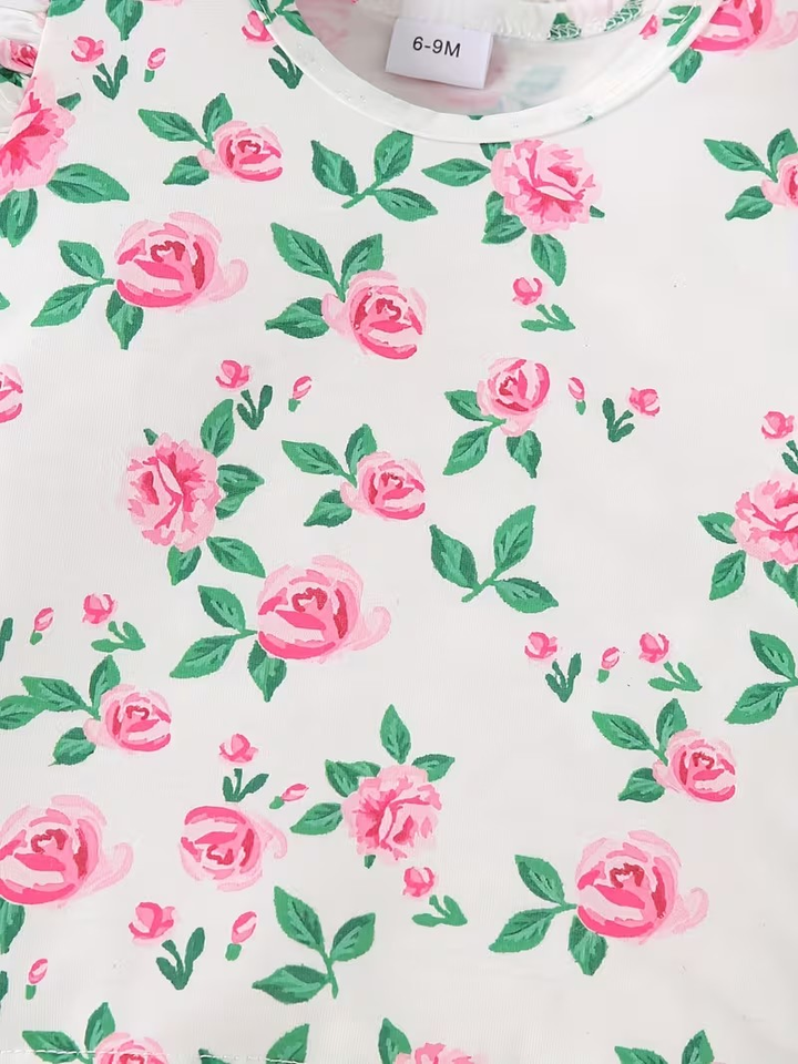 Summer Three-Piece Set for Baby Girls Jersey 100% Cotton Floral Print Artistic Butterfly Letter Neck Flutter Sleeve Casual Tops