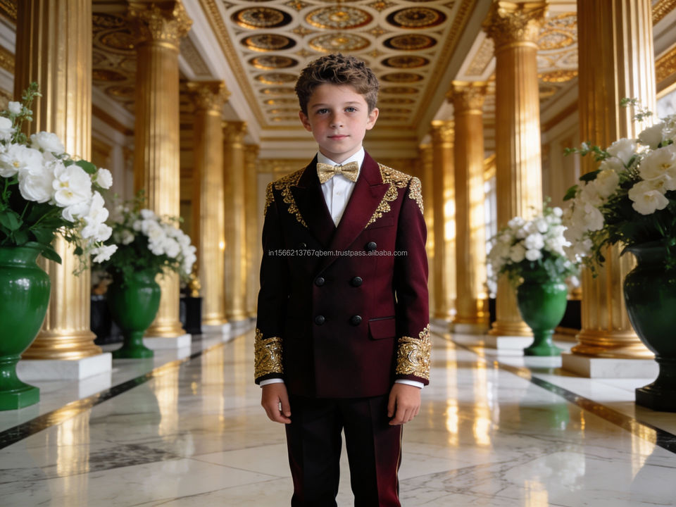 Kids Cream Gold Embroidered Tuxedo Suit – 3 Piece Boys Wedding & Party Formal Suit with Bow Tie