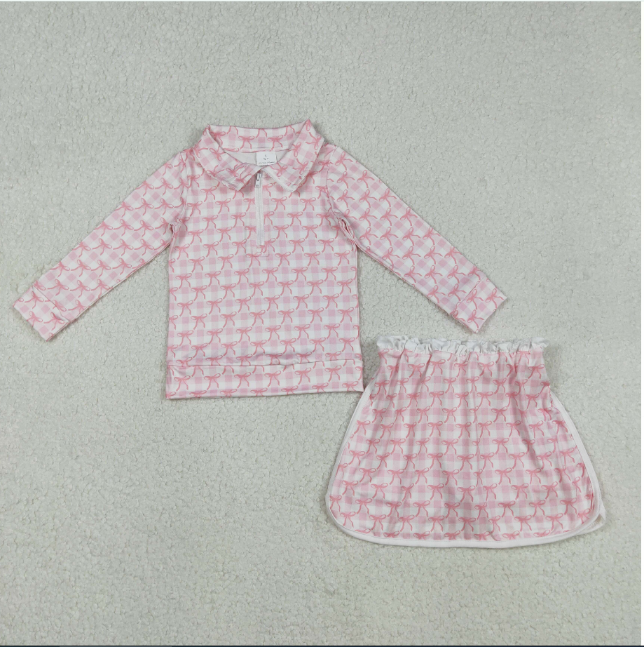 Kids GLD1014 Pink Bows Plaid Long Sleeve Zipper Top Skirts Shorts Girls Clothes Set