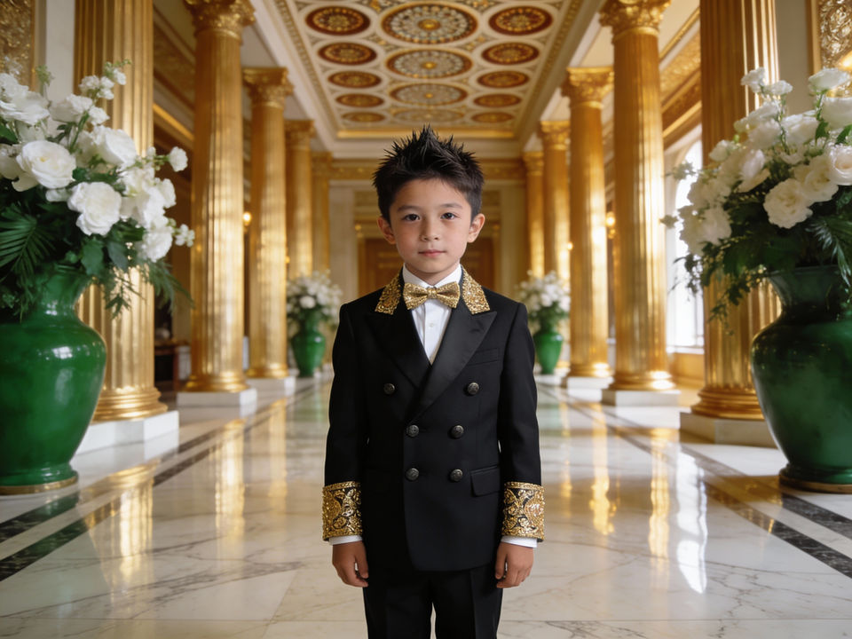 Kids Grey Gold Embroidered Tuxedo Suit – Boys Double Breasted Wedding & Party Formal Suit