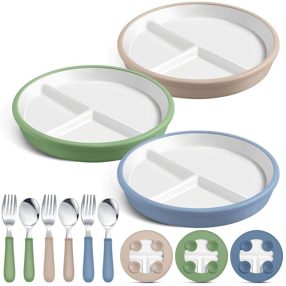 Kids Porcelain White Plates with Silicone Sleeves Microwave Non Slip Divided Baby Plates with Suction Cup for Kids Toddlers