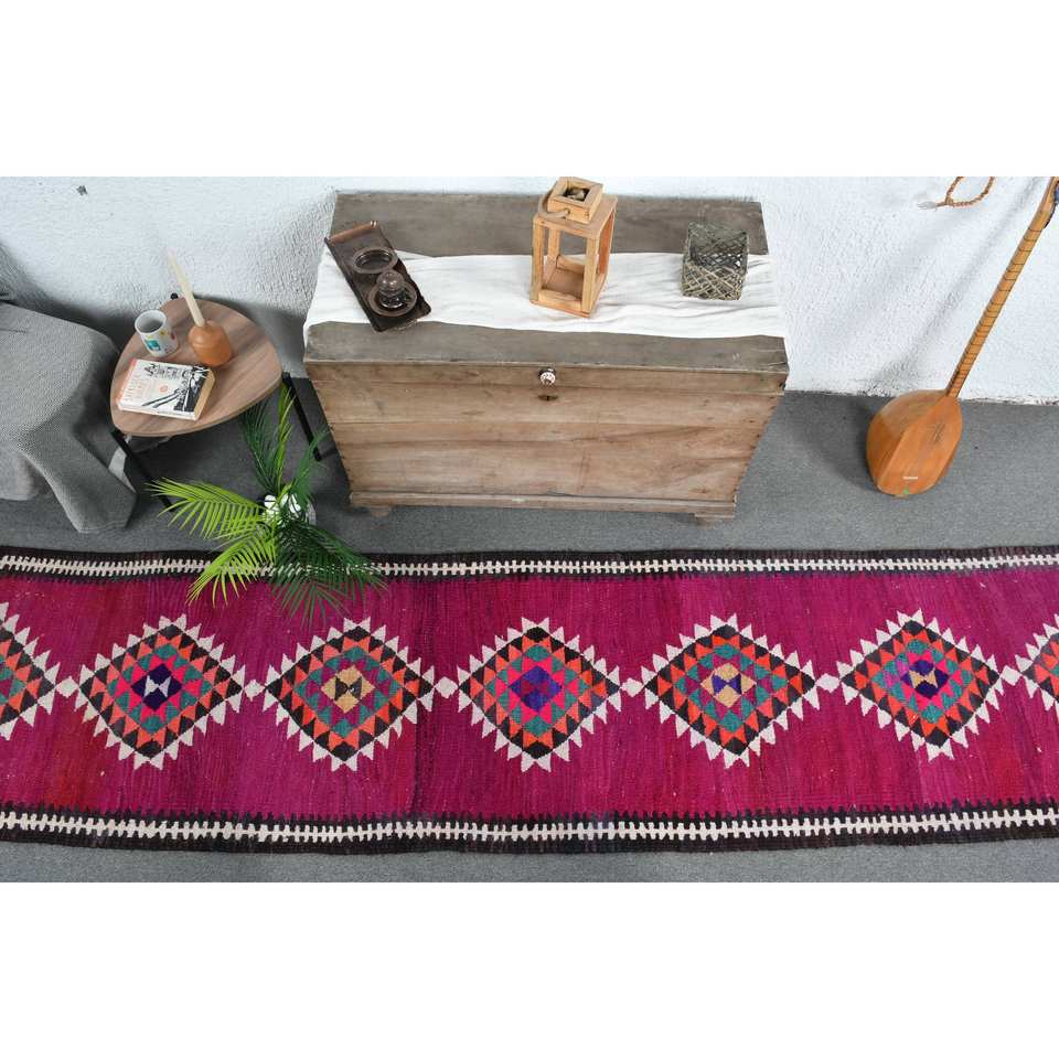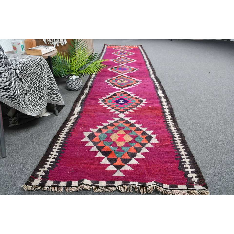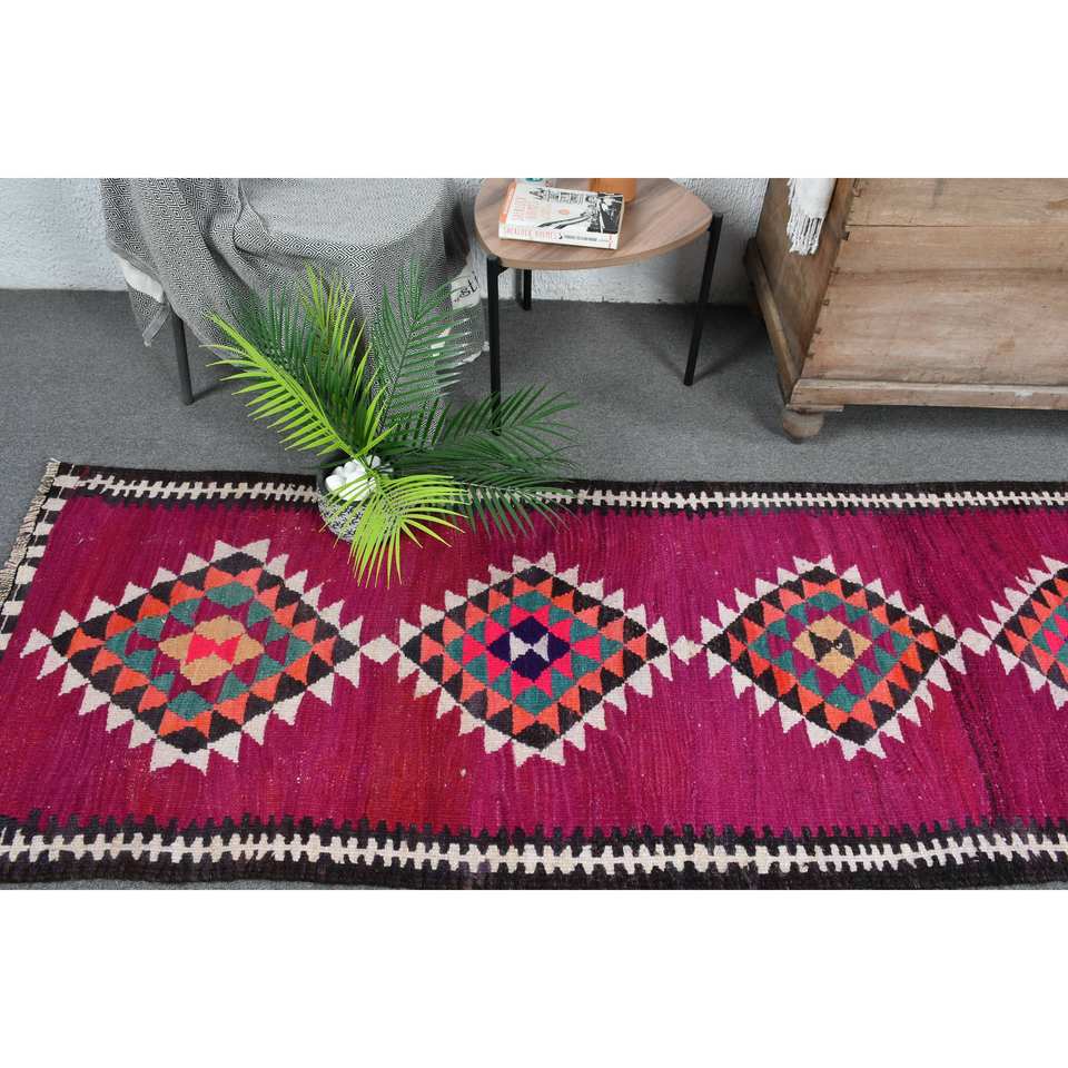 Kilim Purple Black Wool Rug 2.6 X 12.3ft Turkish Flat Weave Jacquard Technique with Abstract Pattern for Teens for Hallway