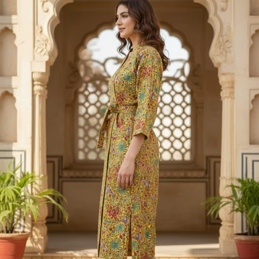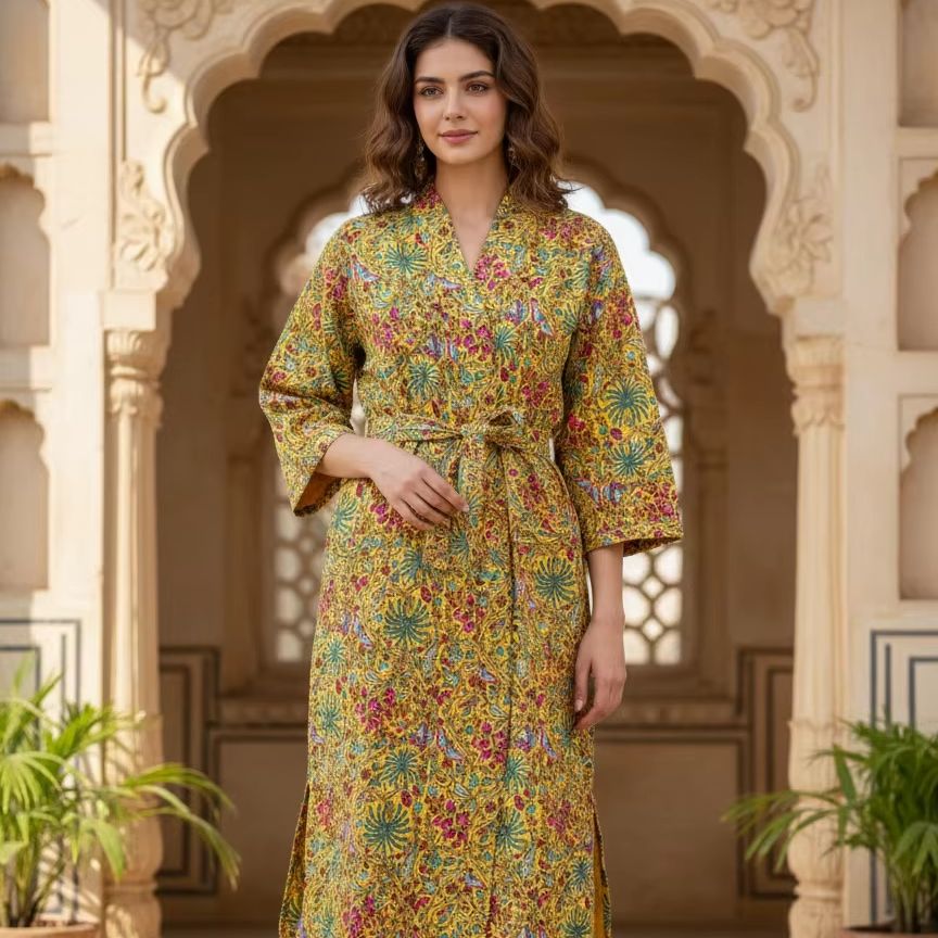 Kimono New Kantha Print Full Sleeves Breathable Soft Reversible Design with Belt Women's Sleepwear