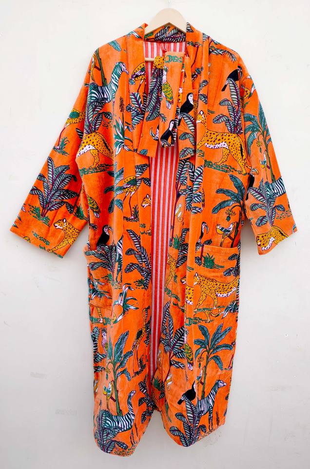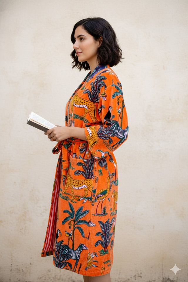 Kimono Velvet Women's Robe V-Neck Drawstring Closure Full-Length Long Sleeves Printed Design Elegant Style Winter/Autumn