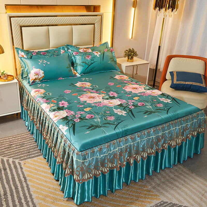 King Size Ice Silk Bedsheet Lace Summer Mat Parisian Style Sea of Flowers 3 Pieces 2 Pillow Cases+bed Skirt Sets R1865
