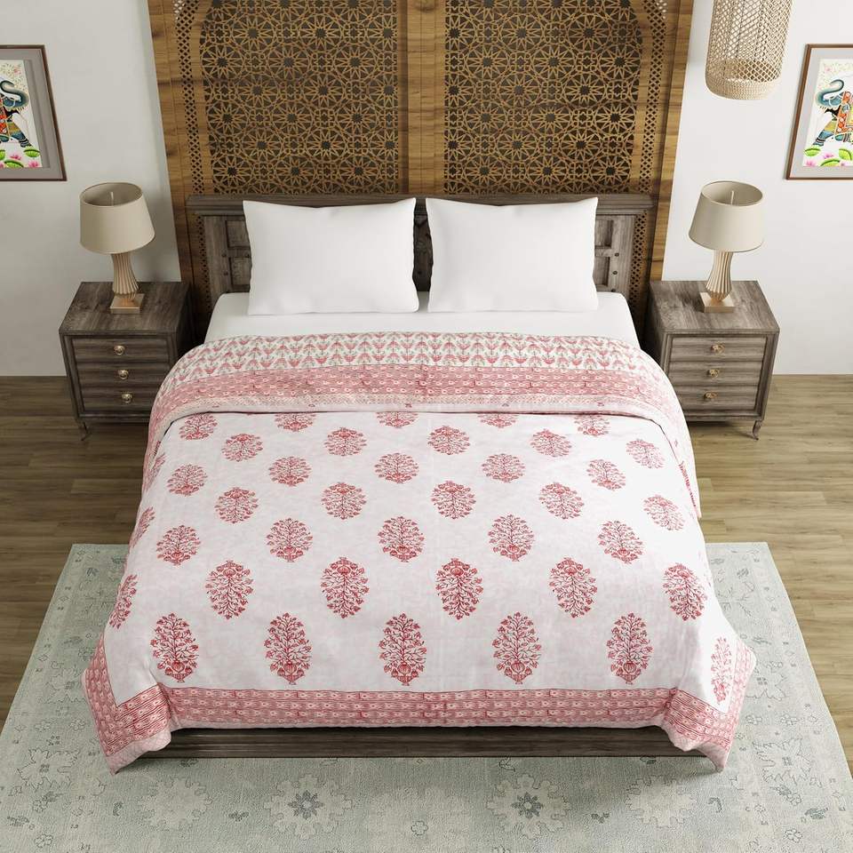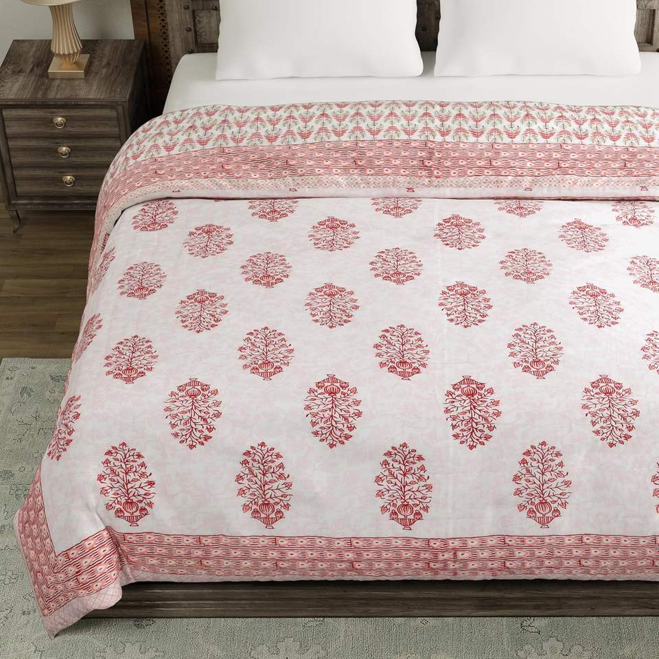 King Size Quilt/Rajai Cotton Hand Block Print Maroon Pot Kantha Patchwork Design Winter Duvet (225 cm X 270 Cm)
