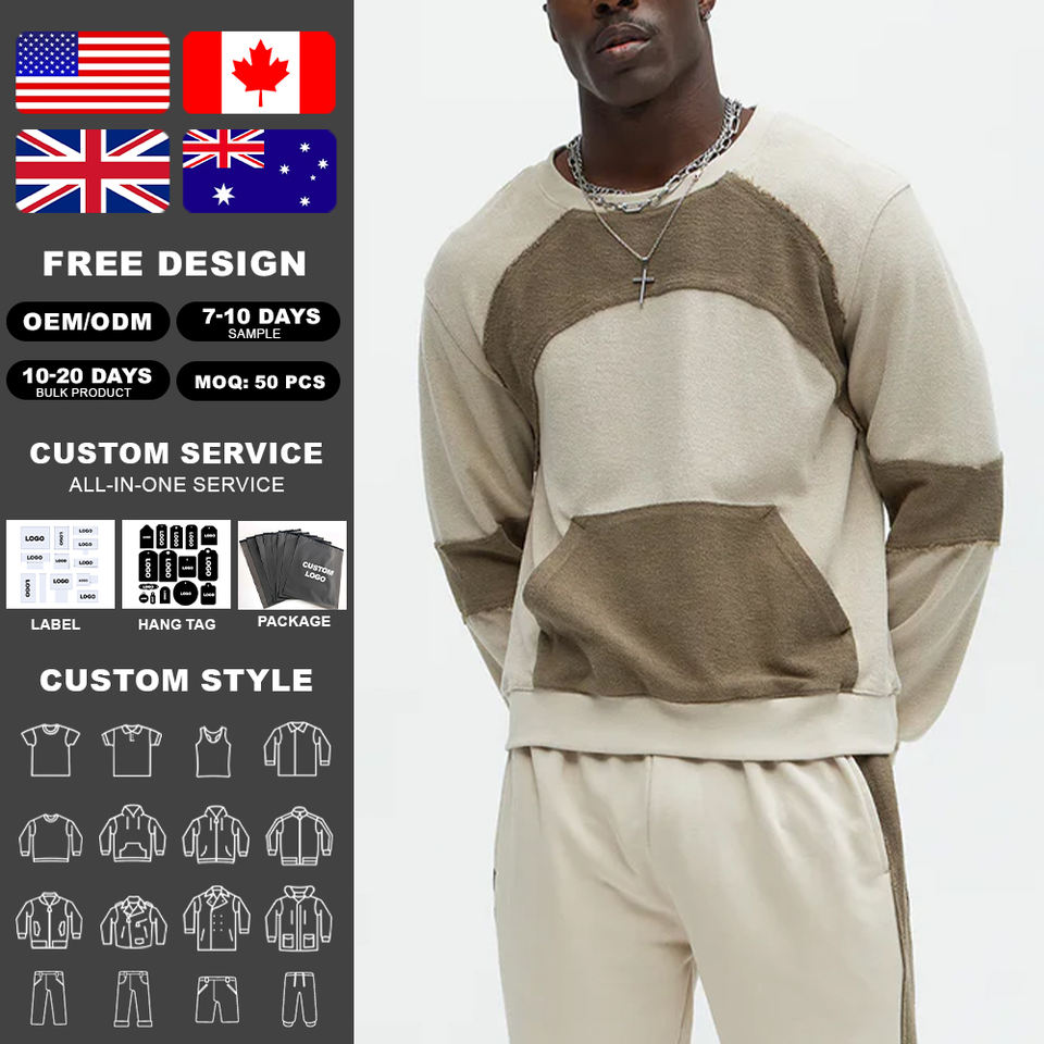 KingSen Custom Color Block Patchwork Crewneck Sweatshirt Men Oversized Heavyweight Cotton Reversed Fleece Streetwear Pullover