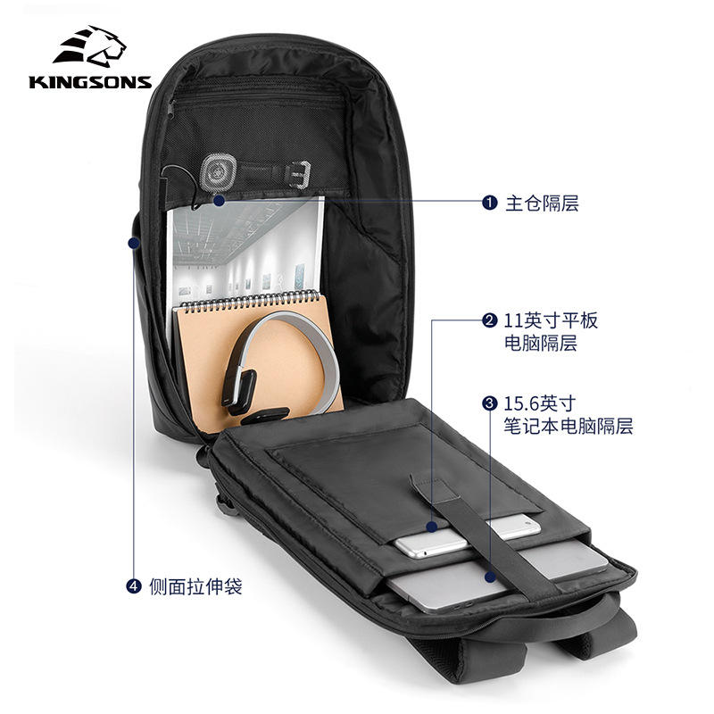 Kingsons Backpack 15.6 Inch Laptop Compartment Waterproof Business Travel Bag Multi Compartment Large Capacity Black