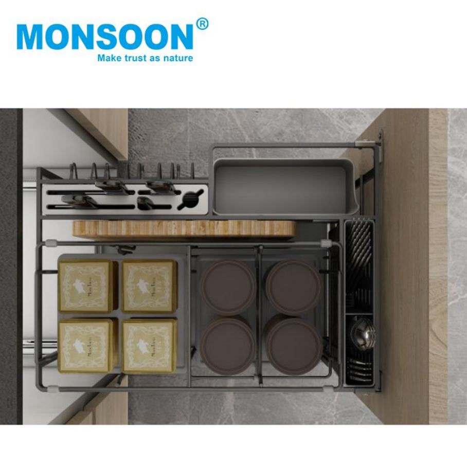 Kitchen Cabinet Sink Organizer Multipurpose Seasoning Basket Silver Nano Plated Soft-Closing Slide System Carbon Steel Pull-Out
