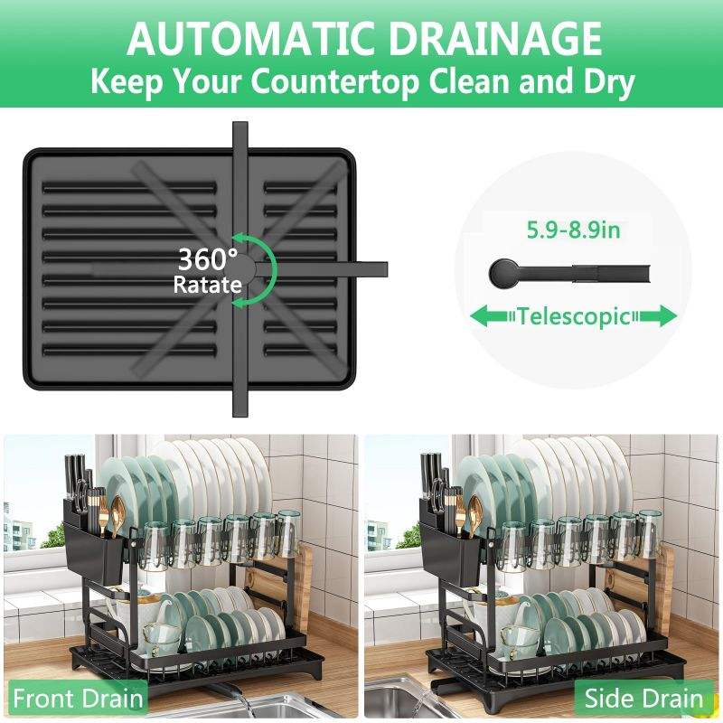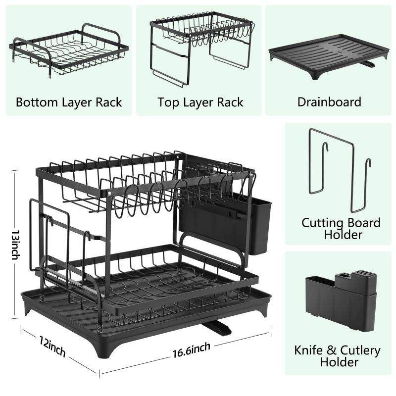 Kitchen Countertop Dish Rack Rustproof Over Sink Dish Drain Rack Space-Saving 2-Tier Dish Drying Rack with Utensil Holder