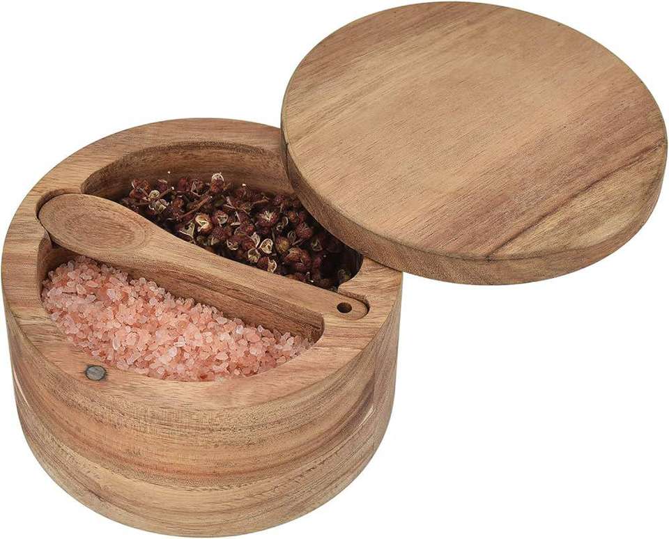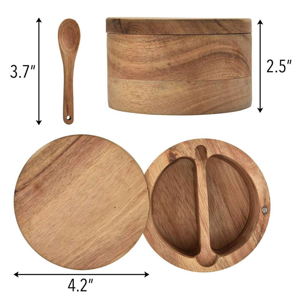 Kitchen Spice Condiment Holder Wooden Spice Box 2 Compartment Salt and Pepper Cellar Acacia Wood Spice Bowls BY HF CRAFTS
