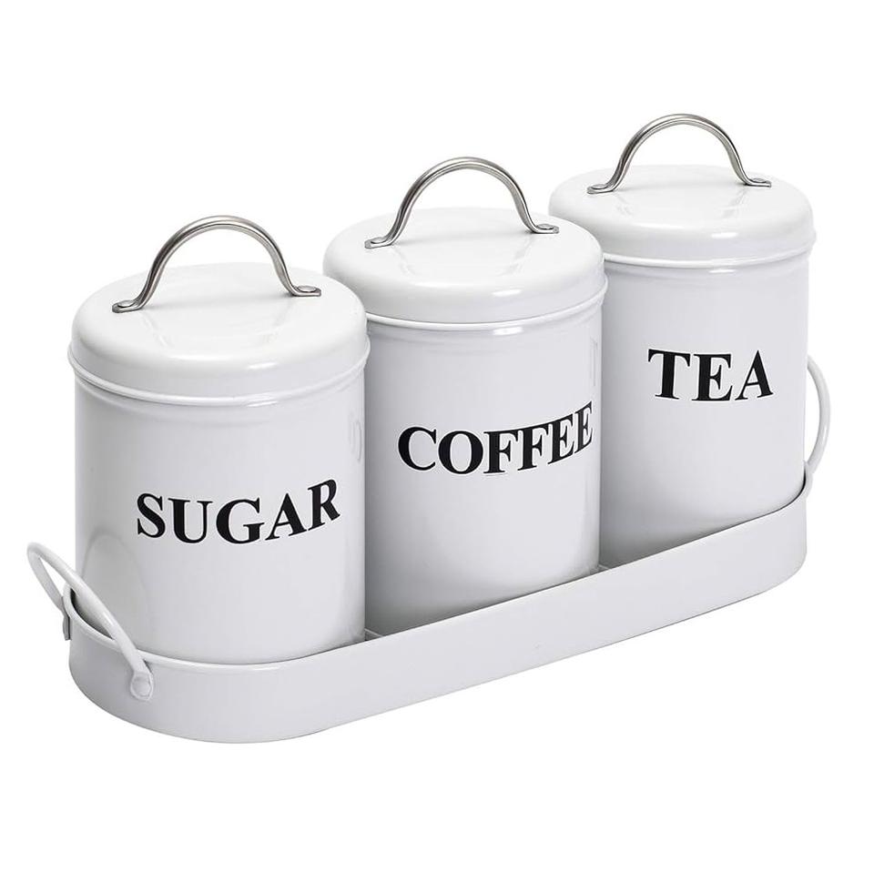 Kitchen Storage Canisters Set With Tray White Finished Decorative Metal Sugar Coffee & Tea Canister and Pots With Handle