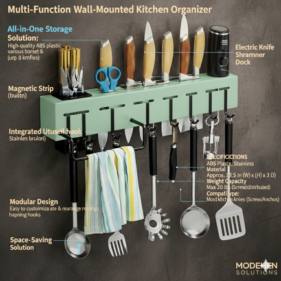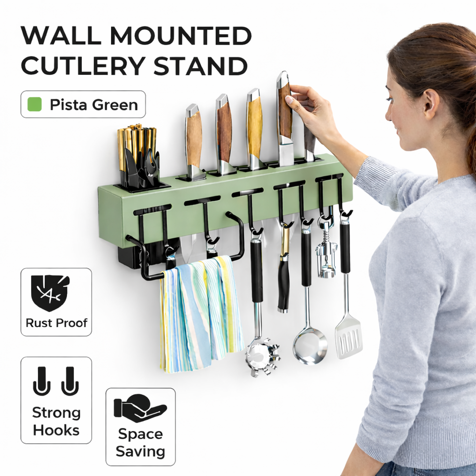 Kitchen Wall Mounted Utensil Rack with Hooks Knife Holder Storage Shelf Multi-Purpose Hanging Organizer