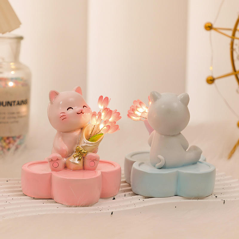 Kitten Tulip Night Light Epoxy Resin Folk Art DIY Handmade Birthday Gift for Girl Girlfriend High Sense Home Decoration