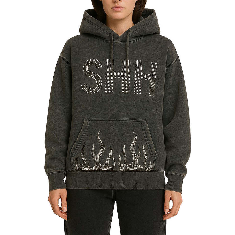 Kivotech Custom made Women hoodies with acid wash rhinestone embellishments vintage finish and distressed 100% cotton