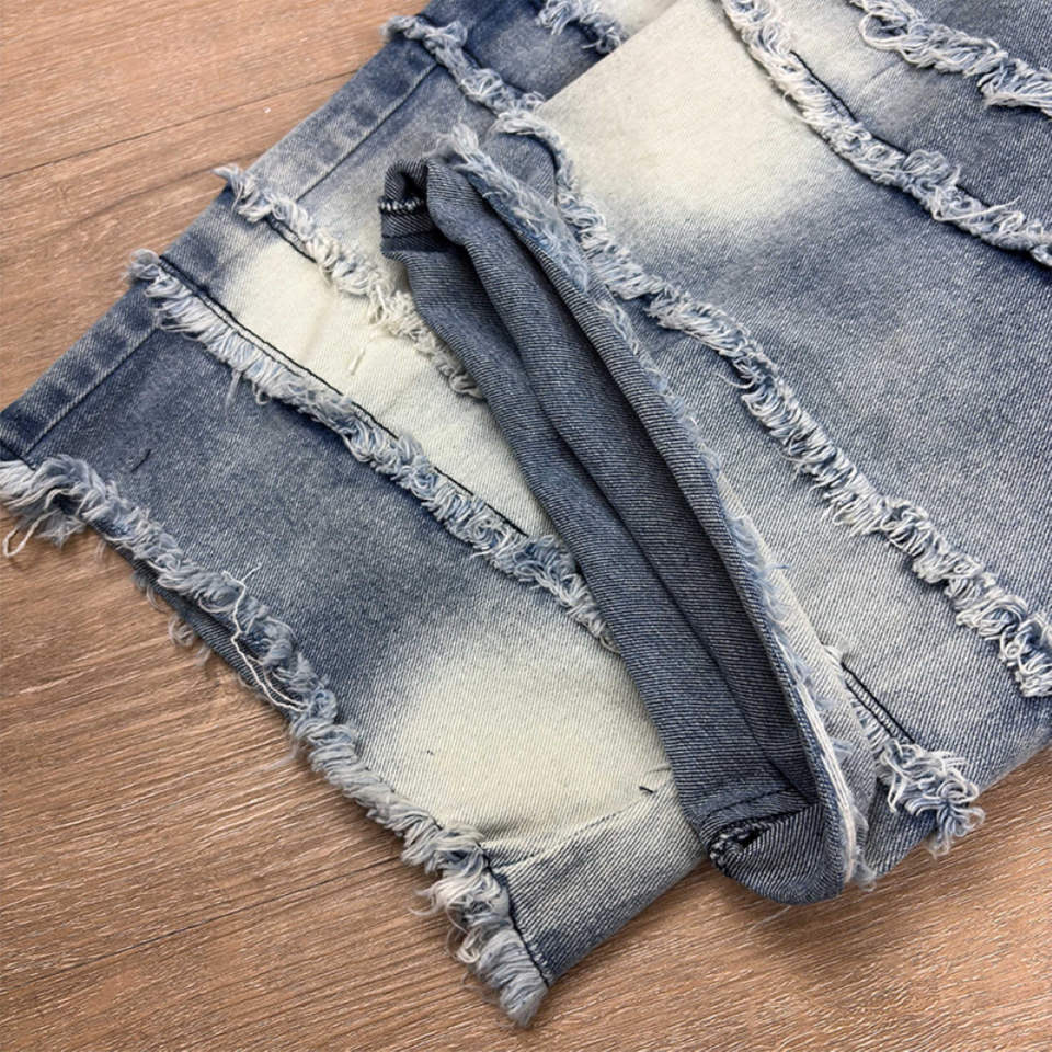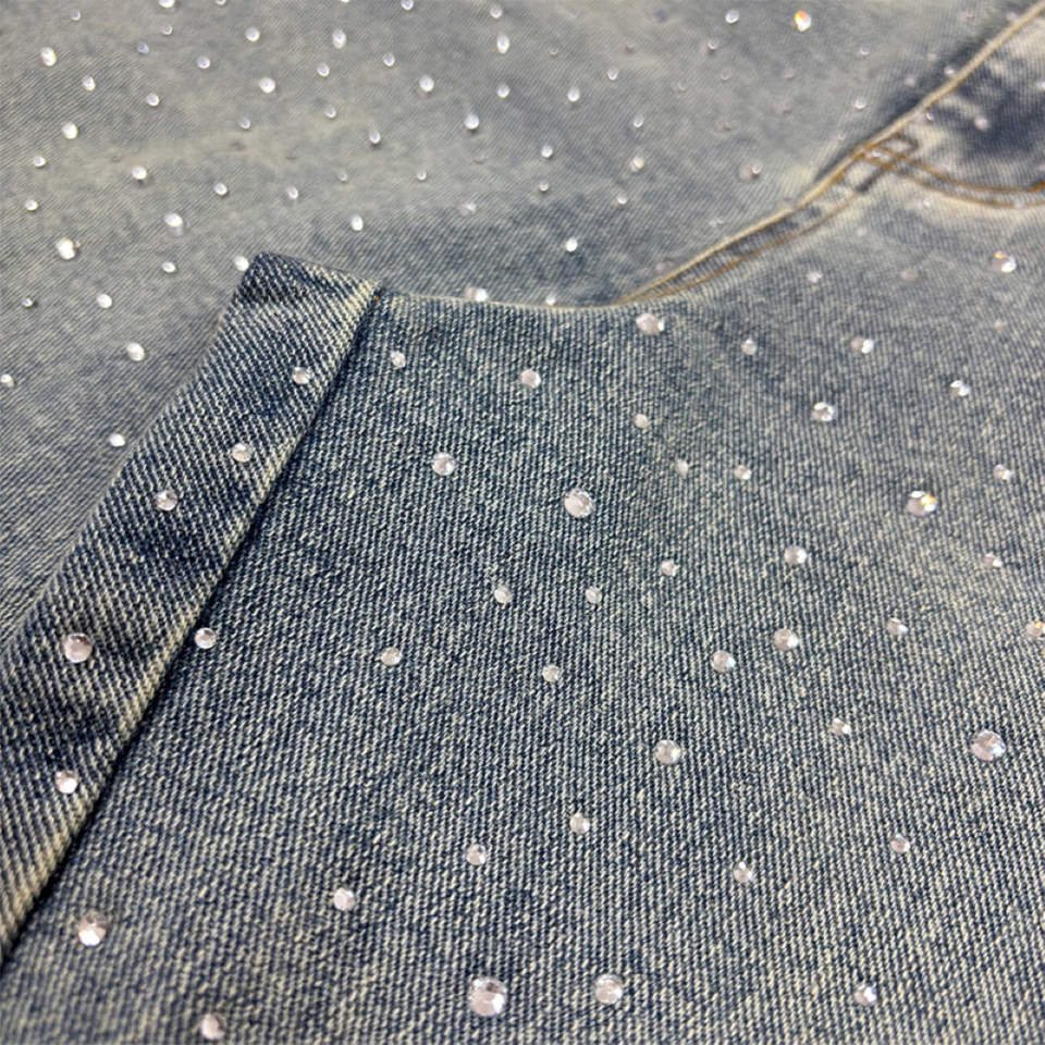Kivotech Customized Streetwear Knee Length 100% Cotton Vintage Acid Wash Rhinestone Applique Distressed Denim Shorts for Men