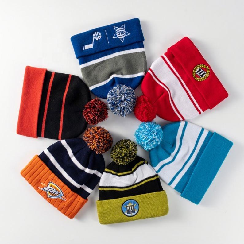 Knitted Hat Custom Logo Jacquard Sport Club Football Team Fans Bobble Hat Embroidery Logo Patch Beanie Pom Pom Hat