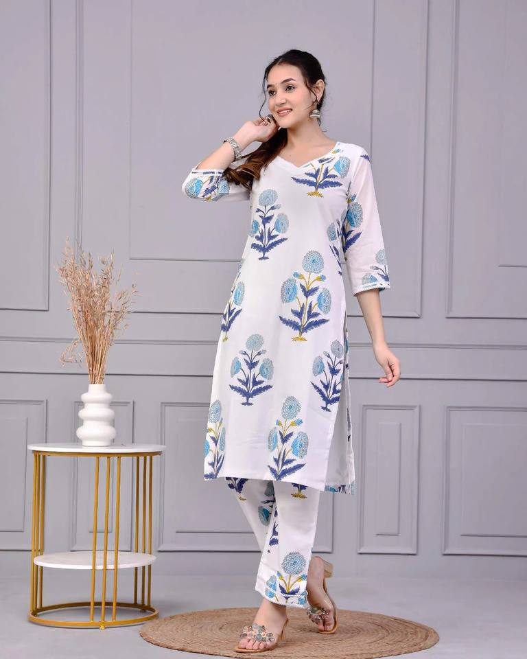 Kohinoor White Block Print Co ord Set Women Ethnic Casual & Party Wear for Best Price