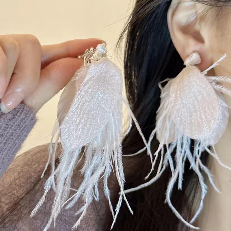 Korean Style Bridal Wedding Jewelry Fairy Feather Earrings Long Tassel Drop Clip Earring Non Pierced Wholesale