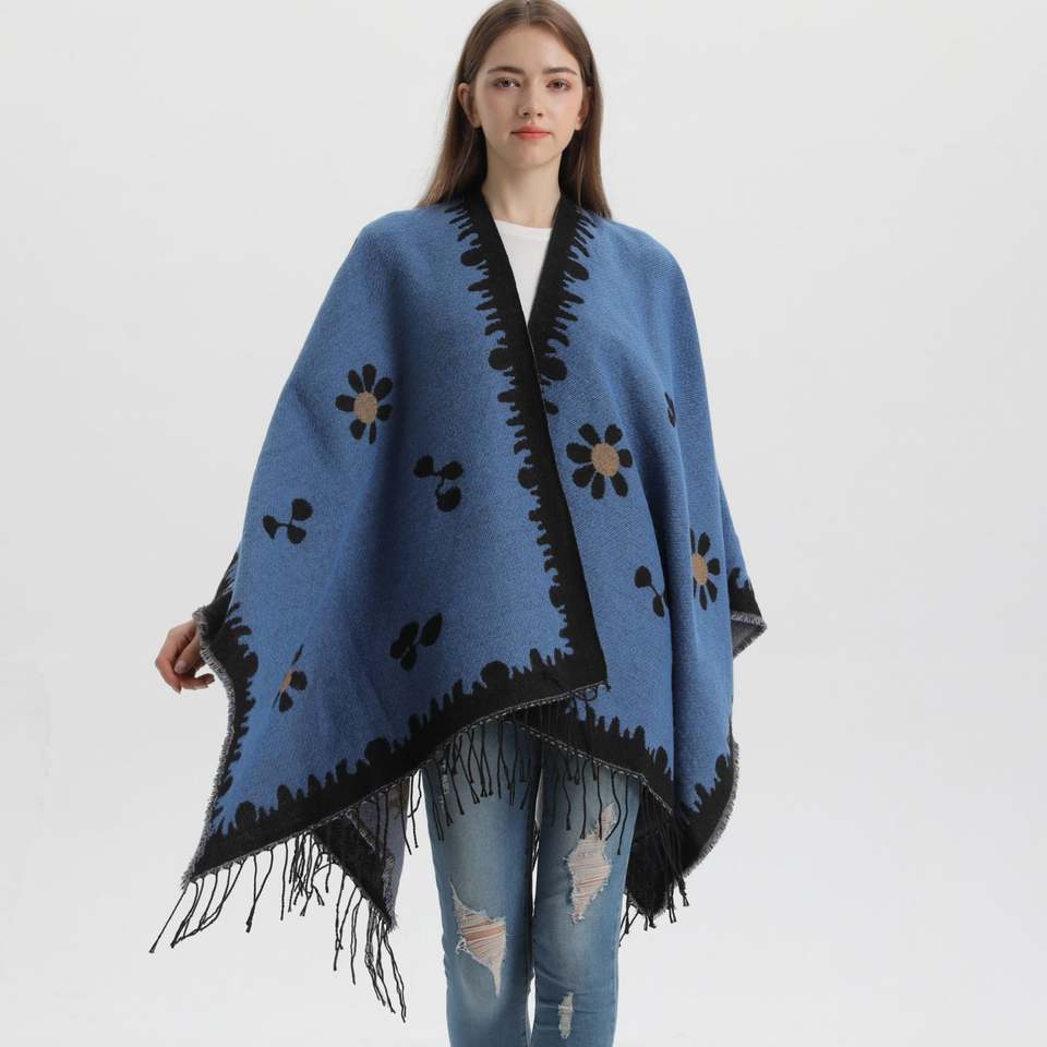 Korean Style Fashionable Autumn Winter Argyle Leaf Knitted Reversible Lightweight Shawl Flower Tassel Split Warm Outerwear Cape