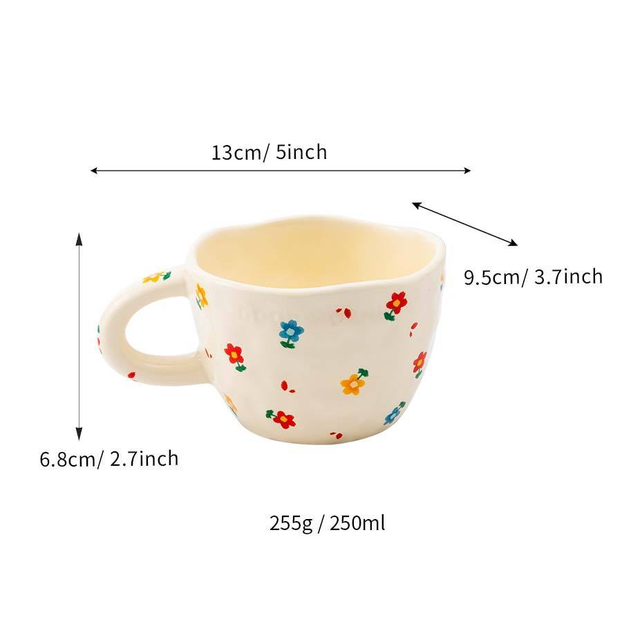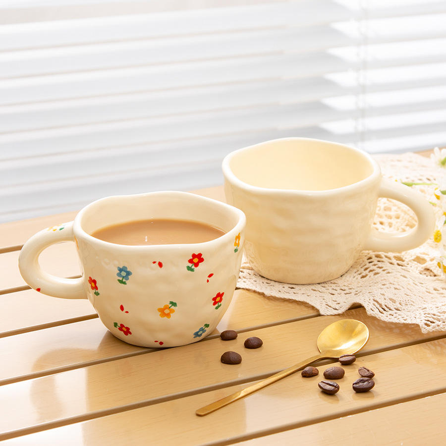 Korean Style Hand Molded Ceramic Mug Off White Floral Pattern Single Cup With Handle For Breakfast Milk Coffee