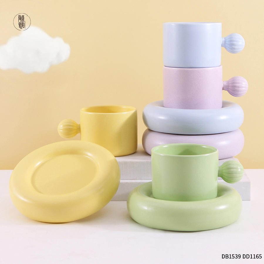 Korean Style Macaron Ceramic Coffee Mug Set With Saucer Solid Color Purple Blue Yellow Green Afternoon Tea Cup