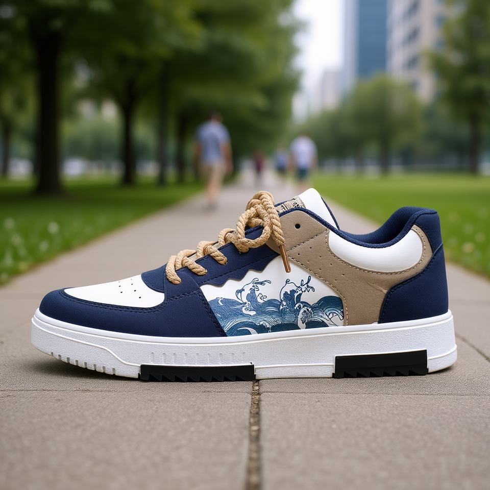 Korean Style Men's Casual Shoes White Blue Print Lace-Up Round Toe Breathable Pu Upper Rubber Sole All Seasons Fashion Trend