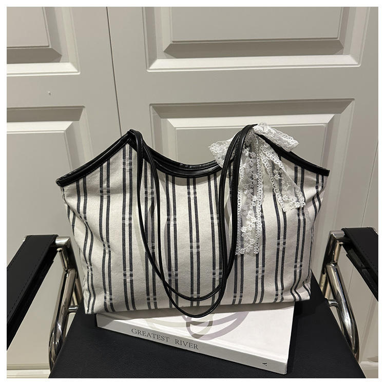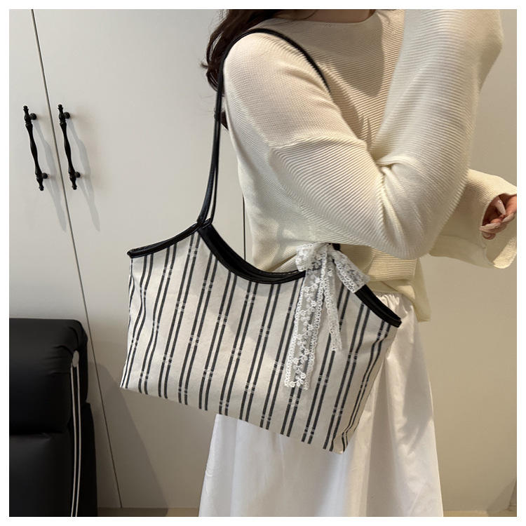 Korean Style Striped Tote Bag New Spring 2025 Simple Shoulder Design Versatile and Popular for Women Open Closure