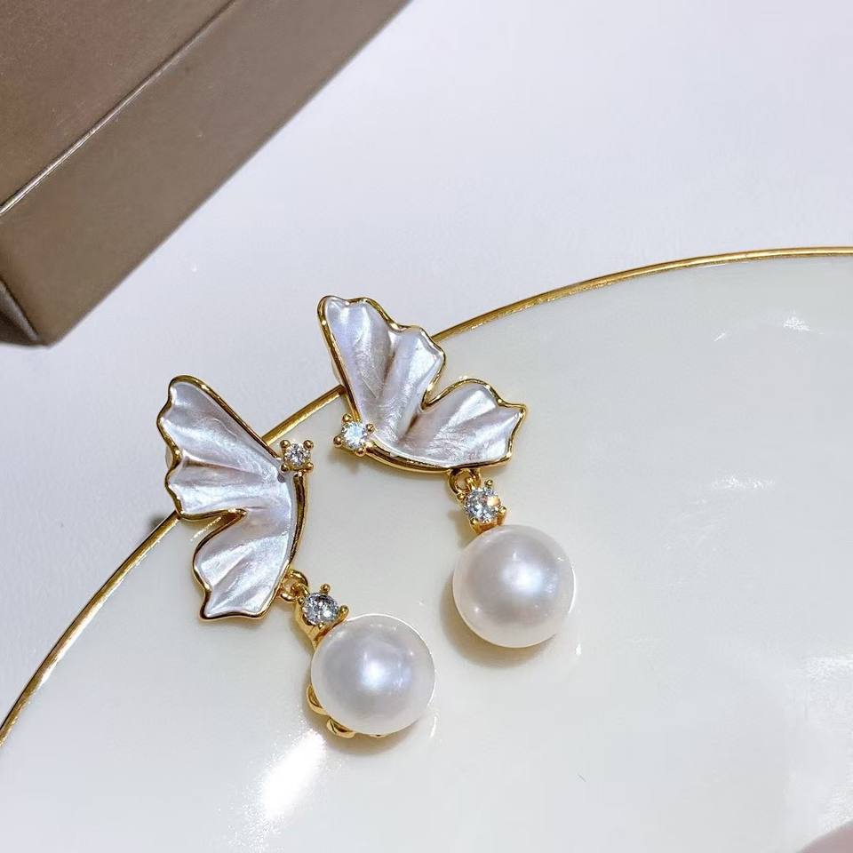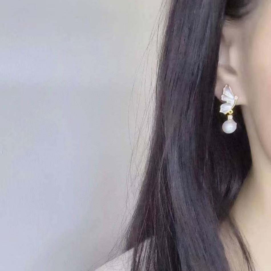 Korean Version 7-8mm Natural Freshwater Pearl Dangle Earrings for Women Versatile Enamel Glaze Butterfly Design