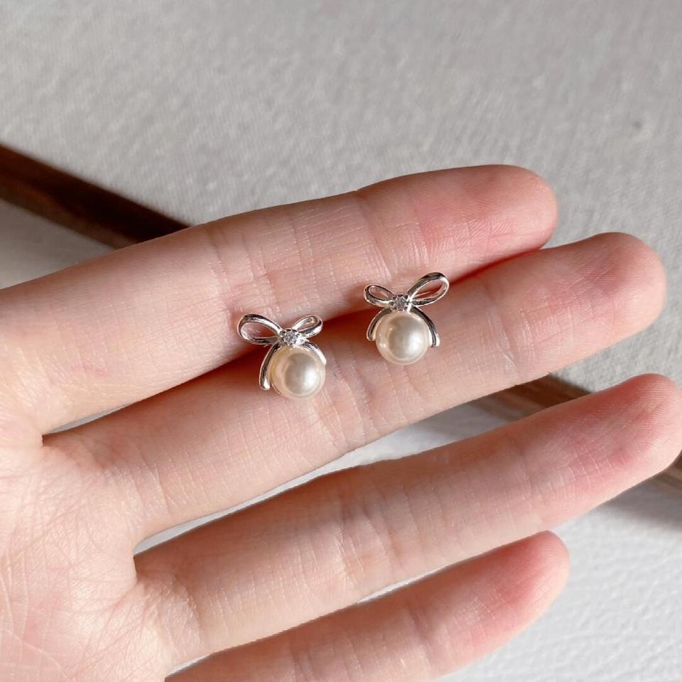 Korean Version S925 Pure Silver Bow Pearl Earrings Japanese Cute Design Fresh Sweet Small Fresh Sweet Bow Pearl Earrings for