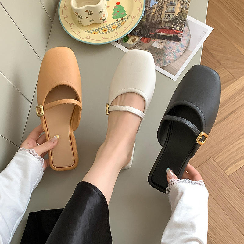 Korean-style French style front opening summer outerwear women's casual retro multi purpose flat bottomed slip on shoes