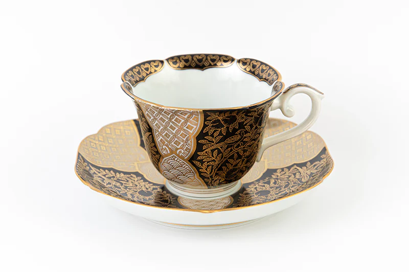 Kutani Ware Black Tea Cup and Saucer Peach Painted Gold Brocade Luxury Traditional Porcelain Gift